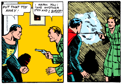 It’s the bottom of the page and Superman hasn’t done anything super for a couple of panels, so the butler produces a concealed weapon from his green bathrobe and plugs away at the man of steel. Butlers were ready for anything back then; he also knows jiu jitsu if he needs a fallback.