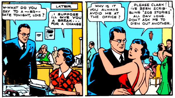 And then, having established that Clark is secretly the best at everything, Siegel and Shuster give him the one thing that he eternally fails at: going on a date with Lois Lane, a reporter currently installed as the Daily Star’s sob sister but destined for greater things.