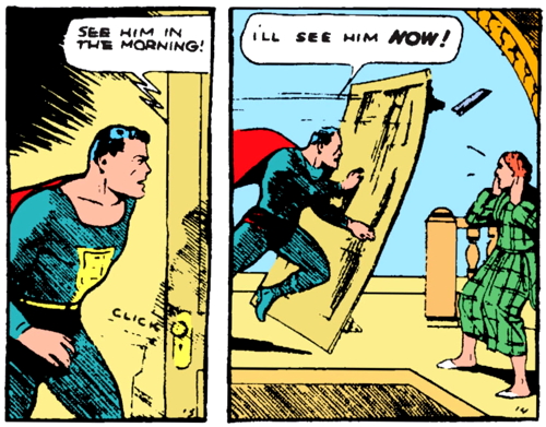 Upstairs in the hallway, the servant gloats, “Yes, this is the governor’s sleeping room — don’t think you’re going to get away with this outrage!” Superman finds that the door is locked, and the butler crows, “Yes! And made of steel! Try and knock this door down!”