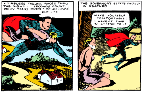 We catch up with him on page 2 in a tremendous rush, carrying a blonde lady in a revealing dress, who’s been bound and gagged for some reason. He’s leaping across the countryside, because at this point all he can do is jump an eighth of a mile at a time; Superman can’t fly yet, and nobody asks him to. He’ll have to wait for the radio show in 1940 to really get airborne, and he doesn’t fly in the comics until 1943.