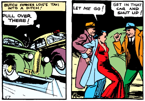 Naturally, this riles up the dance-floor reject, who happens to be the leader of a gang of hoodlums. “I’ll show that skirt she can’t make a fool out of Butch Mason!” the riled hoodlum says, and before you know it, they’ve created a road accident in order to abduct Lois and drive away with her. This is what happens when you try to arrange quiet dinner dates in the pages of Action Comics.