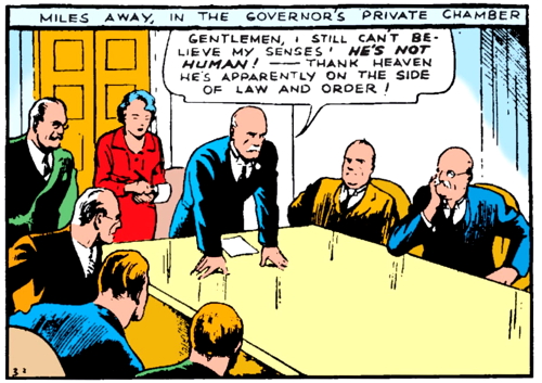 “Gentlemen, I still can’t believe my senses,” the governor informs the science council. “He’s not human! — Thank heaven he’s apparently on the side of law and order!” And that is it, as far as the Evelyn Curry mystery is concerned; done and dusted in three pages, and the world moves on. This is the way that Superman behaves.