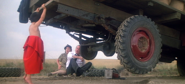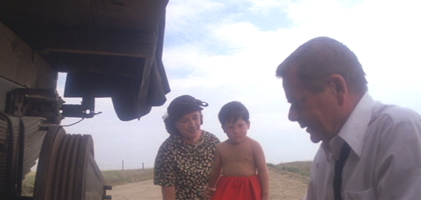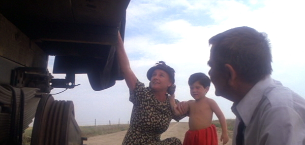 She lifts the boy with much difficulty and walks back to the truck, regarding the child with wonder. Her husband walks ahead, shaking his head, looking back.