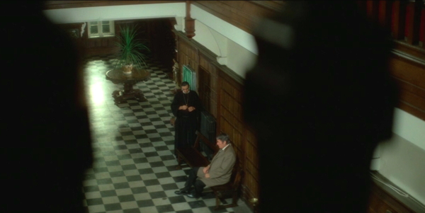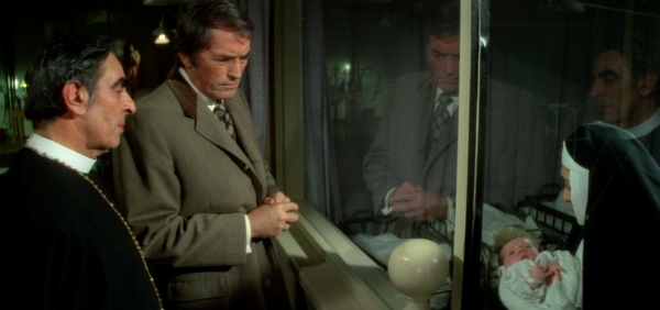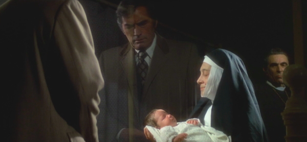 There’s the lighting and the music, obviously, and the camera angles that establish a crippling absence of hope. Robert is sitting in a crappy dark hospital slash church in Rome in the middle of the night, and a priest who I guess is also a doctor??? is telling him some very bad news. Robert’s wife has given birth in this terrible gloomy place, and Father Spiletto says that the baby was stillborn. They probably should have gone to a real hospital, instead of this creepy museum that appears to be staffed by factory second clergy.