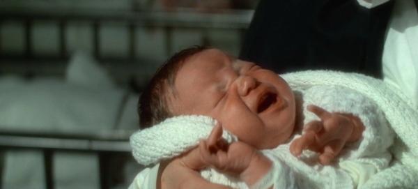 It takes a lot of work to make the audience scared of a baby, so Donner does everything he can. In every shot, the kid’s eyes are screwed shut, and he’s red-faced and howling. The scene is dark, with little pools of light for the actors to stand in, and the kid just does not stop screaming.