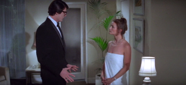 The hotel room is actually kind of a tough scene to pull off, because a lot of it involves criticizing and/or making fun of Clark, which ultimately is not the point of the scene. If you haven’t seen the Donner Cut, the situation is that Lois and Clark are undercover in a crooked newlyweds’ hotel in Niagara Falls, and he’s come in just as she’s getting out of the shower and putting on makeup.
