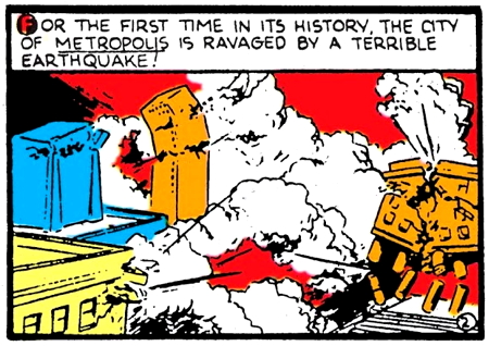 So the fight begins, with Luthor testing Superman’s speed, invulnerability, jumping abilities and resistance to poisonous gas. Superman wins, obviously, but while he’s participating in Luthor’s pissing contest, the villain’s henchmen steal the earthquake machine.