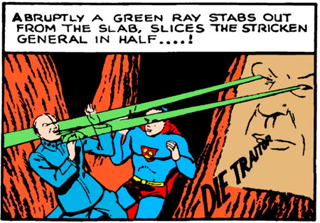 I talked about the Ultra-Humanite last week, and his weird connection to the army of evil Lois Lane clones that plagued Superman comics in 1939. Ultra is introduced in Action Comics #13 as the head of a gang of taxicab racketeers, and he brags that he’s a genius who runs a vast ring of evil enterprises. Then he lures Superman to a sawmill and ties him to a piece of wood that’s slowly approaching a huge buzzsaw, like they did in old silent films.