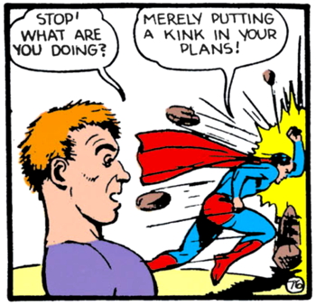 Naturally, Superman can’t help but bust through the wall of one of the stone buildings suspended from the dirigible, as part of his continuing war on architecture. There are three things that Golden Age Superman loves the most, and they’re rescuing Lois, smashing through walls and punching dudes in the face, so this panel is basically the perfect expression of what the Golden Age has to offer.