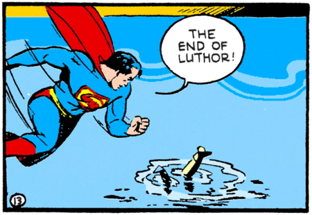 Luthor tries to use his death ray on Superman, but obviously it doesn’t work; our hero breaks free and demolishes the dirigible, killing everybody on board as well as whatever population down below is about to receive a couple tons of mad science falling on their heads. Just imagine being on the receiving end of a plummeting delivery of burning dirigible fragments. That kind of thing could rearrange your whole outlook.