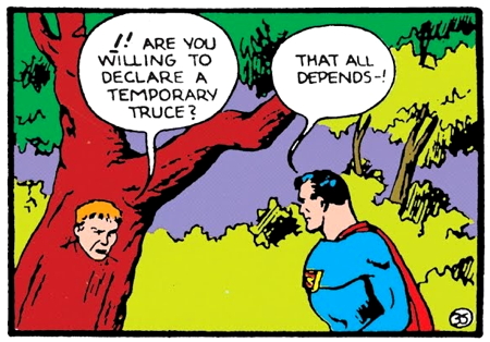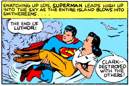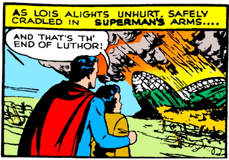 But never mind that, the important thing is that Superman has saved the country of Galonia from participating in a war that probably would have killed fewer citizens than the flaming holocaust that just dropped from the sky. And, as Superman says, “That’s th’ end of Luthor!” so everything turned out okay.