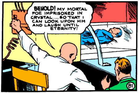 This picture is a panel from Action Comics #14, the Ultra-Humanite’s second appearance, where a bald villain imprisons Superman in a crystal coffin that obviously he busts out of in a hot second.