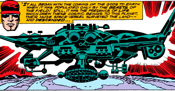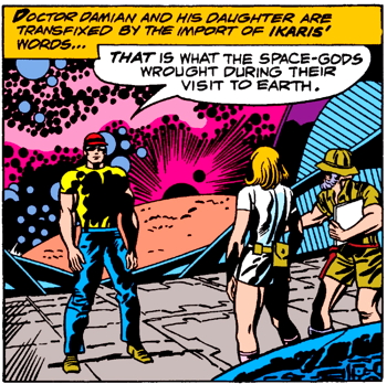 The ideas that Kirby was playing with — that Celestials seeded life on Earth, and then used the Eternals to guide human civilization — come from Erich von Däniken’s 1968 book Chariots of the Gods? Unsolved Mysteries of the Past, a classic piece of crackpottery that was immensely popular in the 1970s and is unfortunately still with us today, layered into the complicated conspiracy theories that currently take up such a horrifyingly large percentage of the American mental landscape.