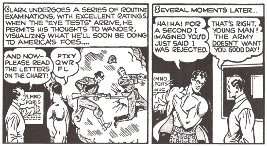 So they came up with an idea that was presented in the newspaper comic strip in February 1942: Clark Kent tries to enlist, but the recruiting office rejects him.