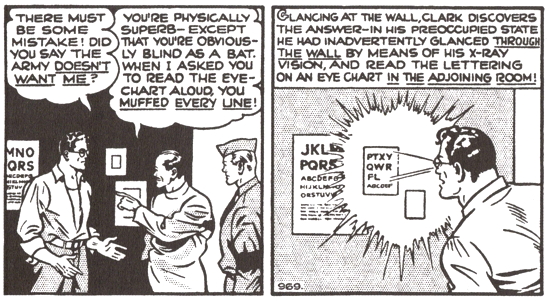 Stunned, Clark asks why he’s been rejected, and the examiner tells him, “You’re physically superb — except that you’re obviously blind as a bat. When I asked you to read the eye chart aloud, you muffed every line!”