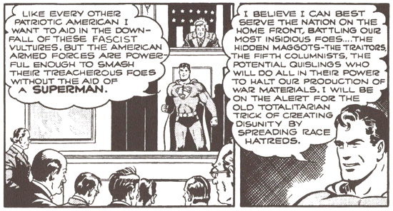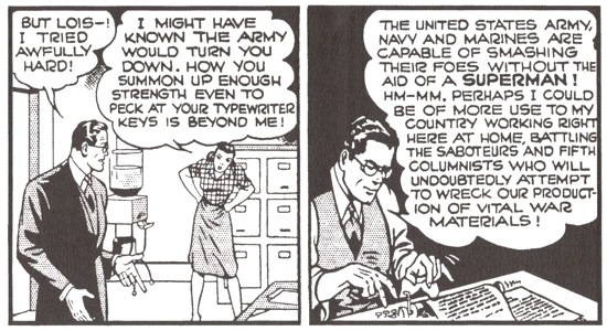 “The United States Army, Navy and Marines are capable of smashing their foes without the aid of a Superman! Hm-mm. Perhaps I could be of more use to my country working right here at home, battling the saboteurs and fifth columnists who will undoubtedly attempt to wreck our production of vital war materials!”