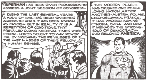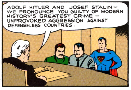 Siegel and Shuster created Superman as the best and the fastest and the greatest at everything, in a series of tall tales that followed the Paul Bunyan model, making the hero increasingly powerful by consistently one-upping the previous story. The very nature of a Superman story is that he can perform any feat and solve every problem; that’s the guy that America fell in love with. So when real-life dictator supervillains Adolf Hitler and Joseph Stalin invaded Poland in August 1939 and kicked off a European war, Americans started fantasizing about Superman going overseas and taking care of the problem.