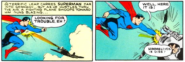 He twists some cannons into pretzels and tears the top off some concrete fortifications, then tells the French forces “Come and get ’em!” which they apparently do. Then he jumps into the air and punches a German plane in the face — “Himmel!” says the pilot, adorably, “Vos is diss?” — and by the end of page 1, Superman’s crashed through the ceiling of Hitler’s retreat.