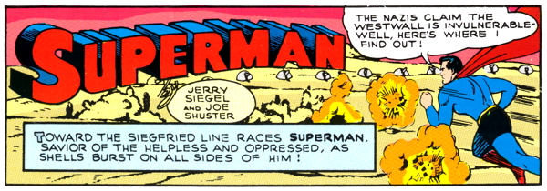 It went great. Superman enters the theatre of war at full gallop, which was the only way he did anything back then. “Keep firing! Ach!” say the German soldiers in their underground fortifications. “That inhuman creature has got to be stopped!” But Superman can’t be stopped by artillery shells; the only thing that slows him down is when he notices there’s a wall that he hasn’t knocked his way through yet.
