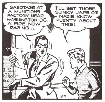 “I’ll bet those slinky Japs or Nazis know plenty about this!” Jimmy declares, and he’s right; the boy knows his slinky Nazis. Superman rushes to the site at super-speed and puts out the fire, and then finds that the foreman is one of those saboteuring fifth columnists. “For the destruction of the United States!” the foreman yells, and throws a hand grenade, which Superman catches and that takes care of the whole problem.