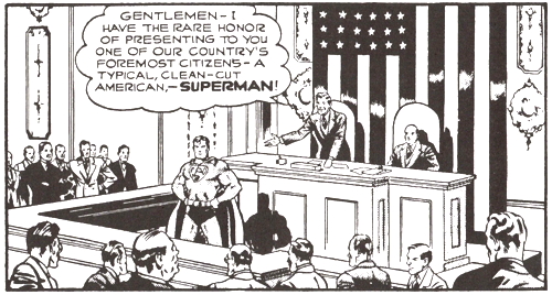 “Gentlemen,” the speaker announces, “I have the rare honor of presenting to you one of our country’s foremost citizens — a typical, clean-cut American — Superman!” I don’t know how typical Superman is supposed to be, exactly.