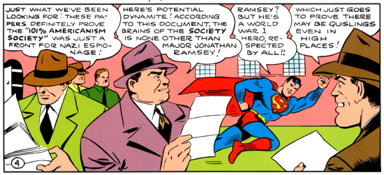 “Here’s potential dynamite!” says one of the federal G-men who are apparently working with Superman. “According to this document, the brains of the Society is none other than Major Jonathan Ramsey!”