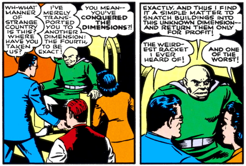 The villain declares, “I’ve merely transported you to another dimension: the fourth, to be exact!” which is a very silly line, and I guess he’s not speaking in rhyme anymore.