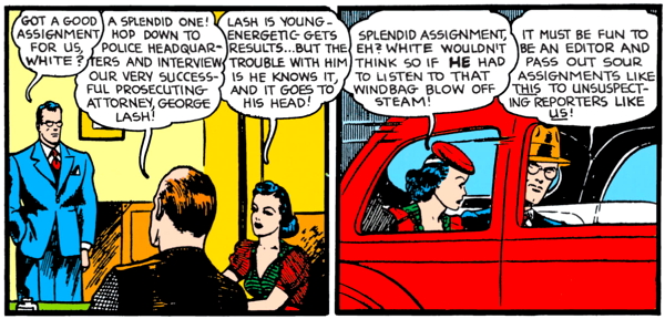 Reporter/media flack was actually a fairly popular off-hours occupation for superheroes. Alan Scott (Green Lantern) and Billy Batson (Captain Marvel) were radio announcers and Johnny Chambers (Johnny Quick) was a newsreel cameraman. I think there were some others, too. Having a job like that gave you an excuse to go chasing off after whatever mysterious/interesting/dangerous thing had just happened. CPA’s and auto mechanics don’t have that kind of flexibility.
