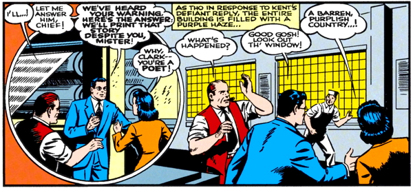 I’m serious about rhyming being a real problem area for Superman. He’s supposed to be a good writer, too; it’s weird that he’s so bad at this. You have to imagine that it leaves him open for some kind of poetry-based attack. Offhand, I can’t think of any other poetry-themed superfoes, but I bet Batman has one; that kind of thing has Batman written all over it.