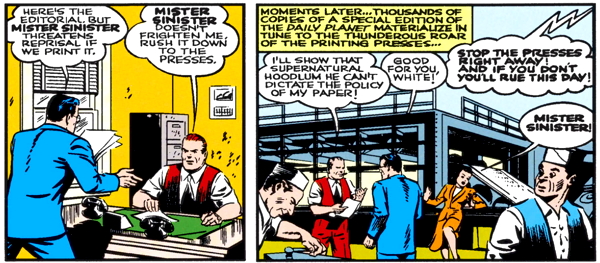 Clark writes an editorial criticizing Mister Sinister, which ticks the villain off for some reason that I can’t quite figure. I mean, the guy is appearing in the sky and announcing his name and exactly what he’s planning to do in rhyming couplets, but for some reason, he doesn’t want the publicity of being named in a newspaper story.