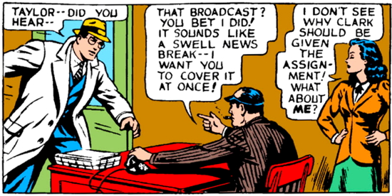 But in that same issue, in the third story, Perry White actually gets up from behind his desk and leaves his office for the very first time.