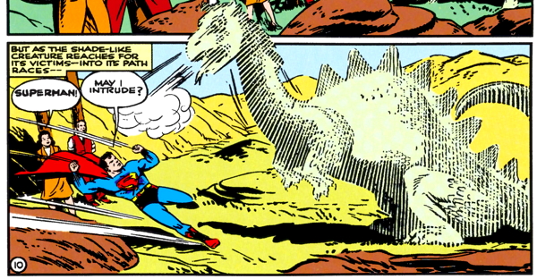 Unfortunately, that about does it for Perry’s participation in the story; once Superman shows up, everybody else fades into the background. He takes care of the creature somehow, and then he gets shot with a ray that doesn’t do anything except kill time for a few panels, and Superman and Mister Sinister dive into a mysterious aura that takes them through the dimensions of length, width and thickness, and then back to the fourth dimension. That is what happens in Superman comics.