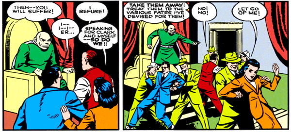 “So that’s why you want to rule the world,” Superman observes, as he wrestles with a tangle of green-suited mugs, “to compensate for your failure as a poet!”