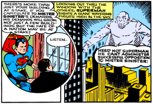 Lois observes that he’s “conquered the dimensions,” whatever that means, and he says, “Exactly. And thus I find it a simple matter to snatch buildings into this unknown dimension — and return them only for profit!” Which reminds me, I didn’t tell you before that when the other buildings were stolen, Mister Sinister asked for $100,000 ransom to send them back. I don’t know what he wants the money for, especially if he lives in a barren, purplish country in another dimension, but there’s a lot that I don’t understand about this story.