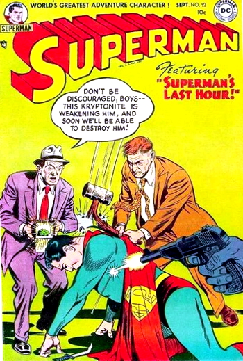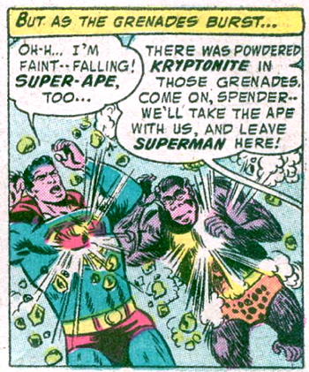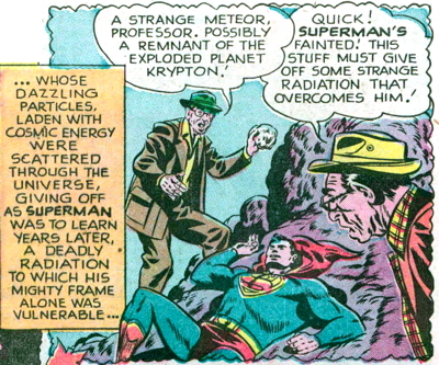“Quick!” the professor replies. “Superman’s fainted! This stuff must give off some strange radiation that overcomes him!”