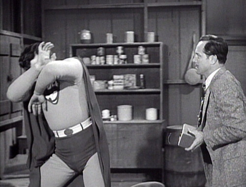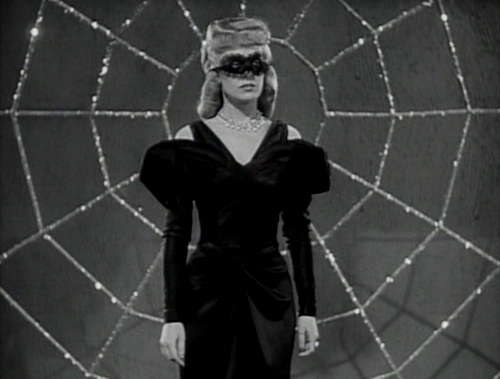In place of the Scarlet Widow, who was an ugly old woman on the radio, the serial introduces the Spider Lady, a ravishing blonde with an enormous electrical web in her office, who wears a black evening gown and mask, even when she’s just hanging around at home with her henchmen. She’s tipped off about the existence of Kryptonite, and she sends her employees to steal it from the museum.