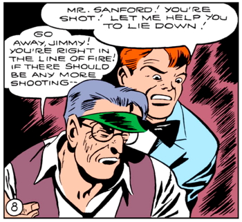 They knew that Jimmy was popular on the radio show, so they tried to include him in a few stories, but the comic was just too violent for a fourteen-year-old character to participate in. The above panel is from a 1944 issue of World’s Finest, and Jimmy’s only contribution to the story is to bandage a reporter’s arm when he gets shot by a sniper through the window of his Daily Planet office.