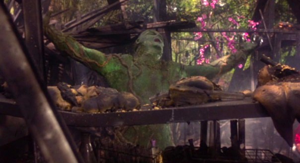 So Swamp Thing speaks in the film, although he uses the halting speech pattern that’s familiar to the comics readers, taking a breath after every few words to indicate that it’s not easy for him to string a sentence together.