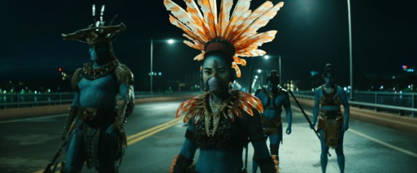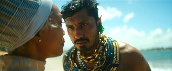 We don’t get to know any of the full-blooded Talokans in particular: if there are any blue-skinned people who have names and feelings of their own, then they did not get a chance to express themselves enough for me to notice. As far as I could see, they had two modes — a relaxed, friendly civilization that doesn’t wear a lot of shirts, and a faceless horde of goblins who lure sailors to their death, and swarm battleships to try and kill the superheroes. As far as I could tell, the swarmers are indistinguishable and entirely dispensible, which I think grates against the movie’s ethics around how you portray other civilizations.